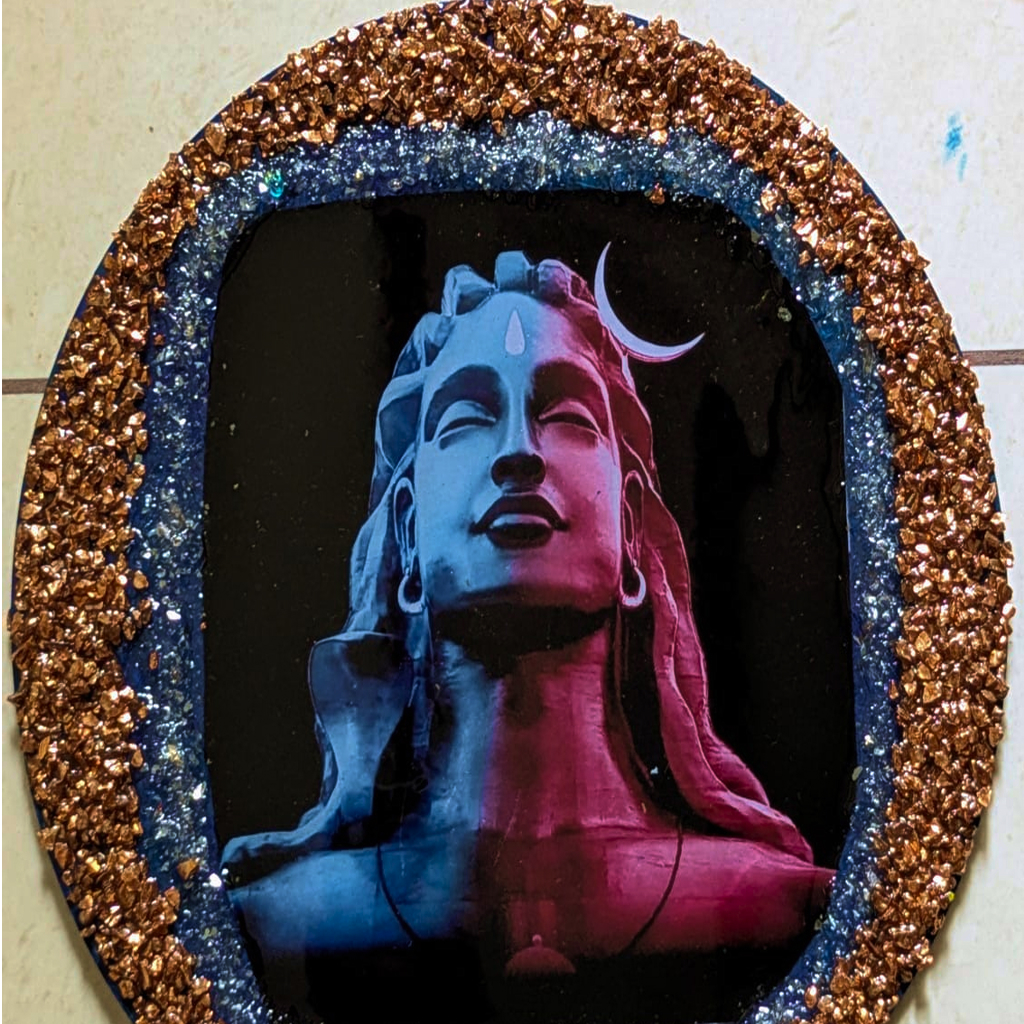 Bring divine elegance to your space with this beautifully handcrafted 10-inch Resin Photo Frame featuring Lord Shiva. Designed with a striking blend of deep black and cosmic blue resin, the artwork showcases a vibrant dual-tone Shiva portrait in shades of blue and pink, highlighted with a crescent moon detail.